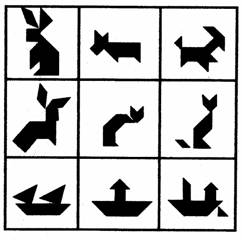 We then started a path with SSIS students by presenting on transparencies a Tangram puzzle and a set of figures that could be made with it. It was pointed out that it would be desirable that pupils be encouraged to work either individually or in small groups to construct these images or invent new ones. This phase might initially seem to be useless from a mathematical viewpoint (many trainees shared this opinion, although they later changed their mind) but it is crucial on the motivational plane and for allowing pupils to make contact with the material and explore intuitively its limits and potentials.
