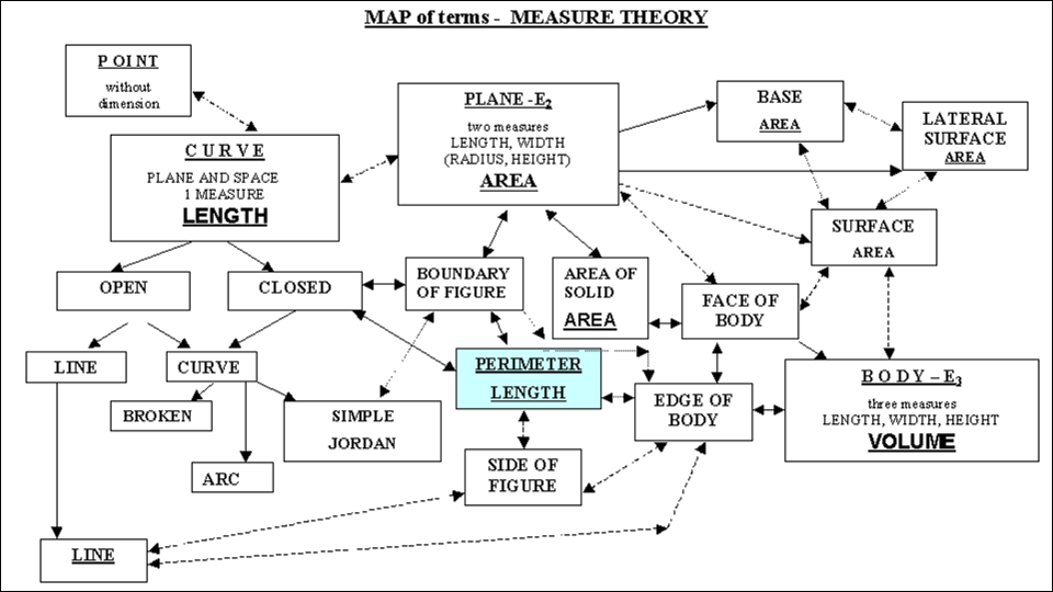Task no. 2 – (See also the Map of Terms or the Slovak website) The teacher trainees find the meaning of the concepts perimeter and area in different contexts in a thesaurus. They investigate the concepts perimeter and area in different contexts (geography, literature, electrotechnics, civics, arts, geometry…). By this activity we want to emphasize that the perimeter (the area) is in mathematics understood as length of a closed curve given by the (ordered) pair [number; measure] and not as a boundary (area) of a planar shape.